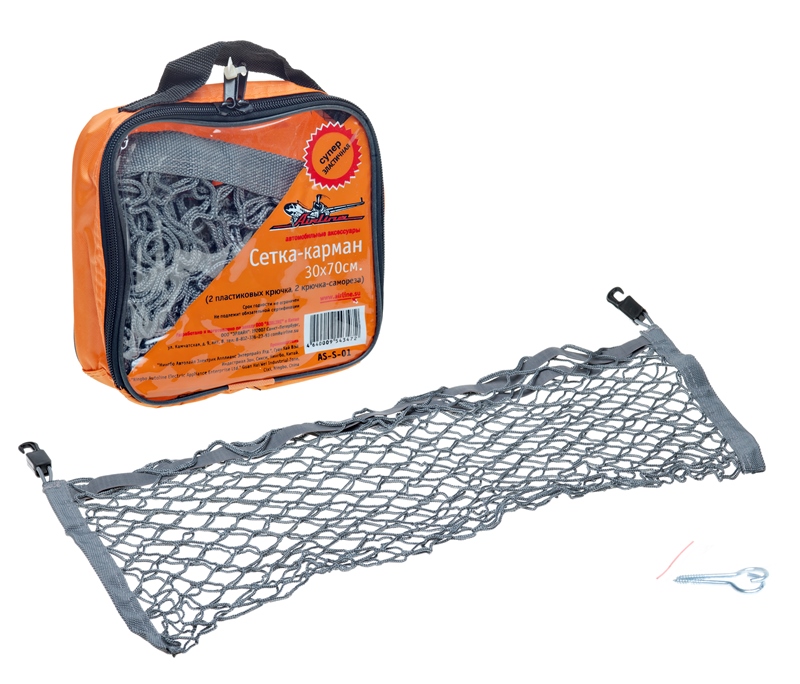Сетка карман в багажник 30х70 см (2 пластиковых крючка, 2 крючка-самореза). Туда можно установить огнетушитель, щетки, перчатки, авто-жидкости и проч. В любой машине собирается масса подобных предметов, поэтому значительно удобнее их всех разместить в багажнике в специальной сетке.