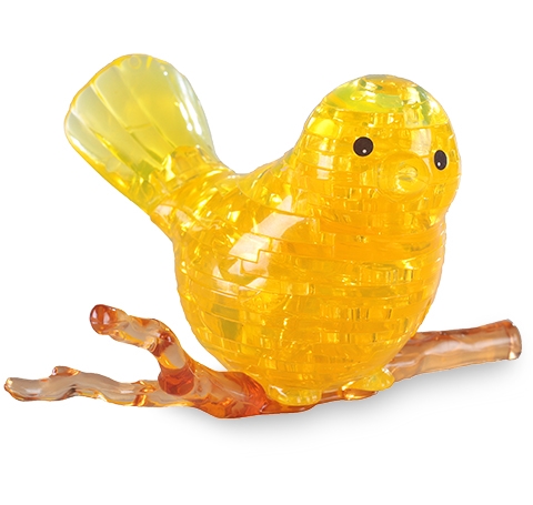 Птичка сидит на веточке, веточка играет роль подставки для готовой головоломки.