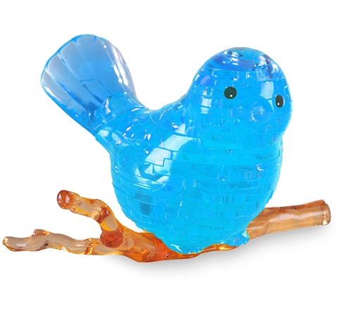 Птичка сидит на веточке, веточка играет роль подставки для готовой головоломки.