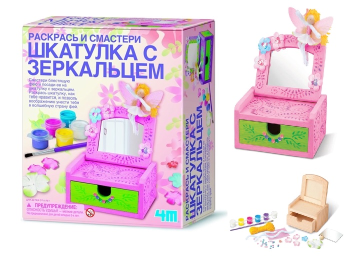 Набор шкатулка с зеркальцем от бренда 4m предлагает вашей юной моднице разукрасить деревянную шкатулку для своих украшений. Смастери блестящую фею и посади ее на шкатулку с зеркальцем. Раскрасьте шкатулку, как вам нравится.