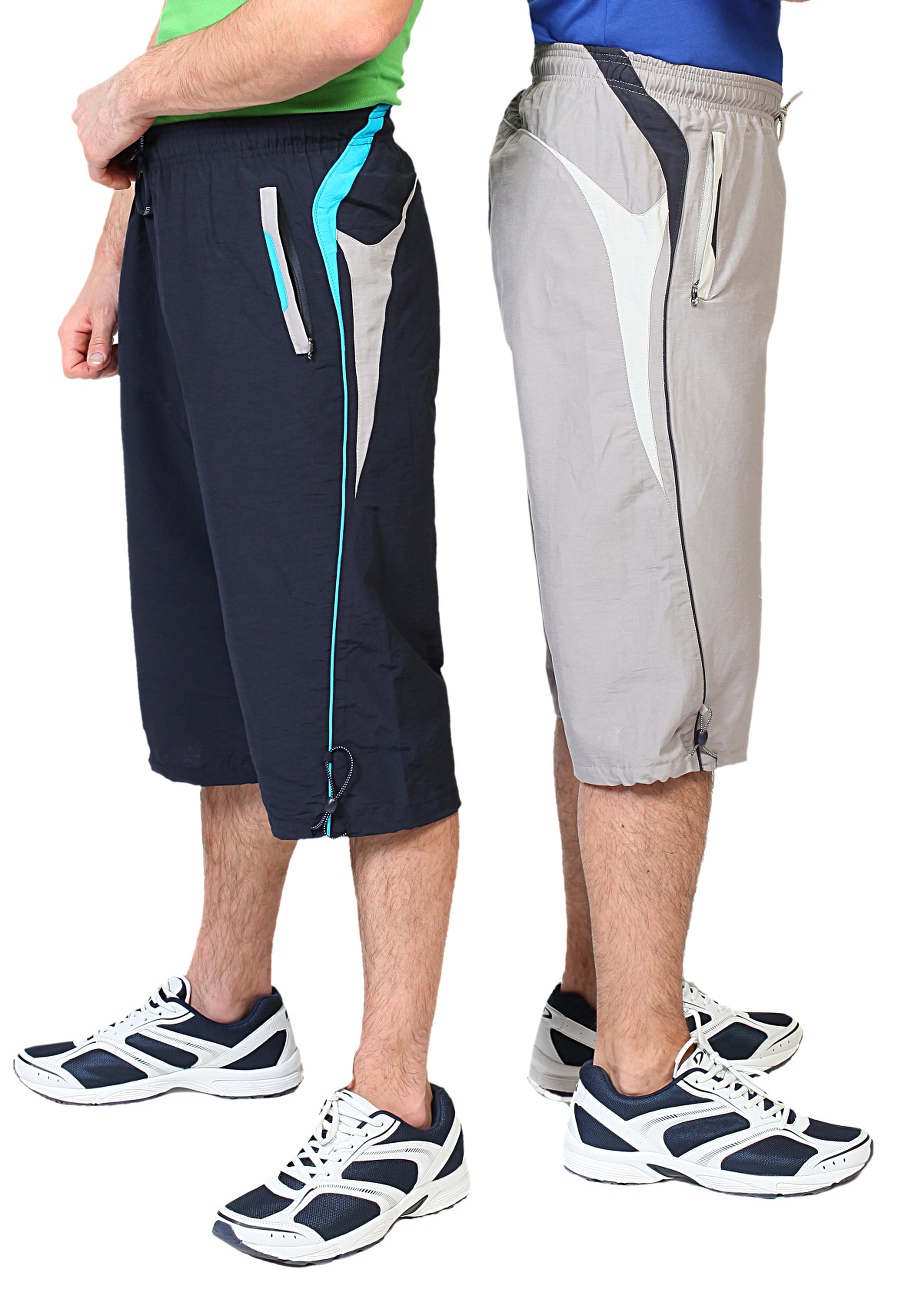 Капри с поясом на резинке. Для дополнительной фиксации с наружной стороны в пояс вставлен шнурок с наименованием торговой марки. Имитация гульфика. Передние карманы на молниях под листочками. Декоративная отделка контрастными вставками и кантом из основной ткани. Внизу с внутренней стороны ширина брючин регулируется пластиковыми фиксаторами на резинке. С левой стороны - цветной принт в фирменном стиле.