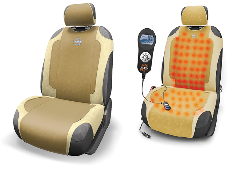 Модель выполнена из износостойкого велюра и подходит для всех типов сидений переднего ряда. В комплекте идёт цифровой пульт управления с ЖК-дисплеем, с помощью которого можно регулировать температуру спинки и сиденья кресла независимо друг от друга, а также выбирать время работы нагревательного элемента. По умолчанию в целях безопасности нагрев отключается через 30 минут непрерывной работы.