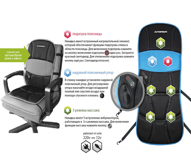 Предназначена для успокаивающего, тонизирующего и профилактического массажа шейного, грудного и поясничного отделов позвоночника, а так же бедер. Массажная накидка на кресло незаменима для людей, ведущих малоподвижный образ жизни, таких как водители, офисные работники, люди преклонного возраста. Она будет полезна и людям, занимающимся спортом, для снятия избыточного напряжения мышц, после тренировки. Может использоваться в автомобиле, офисе или в домашних условиях.