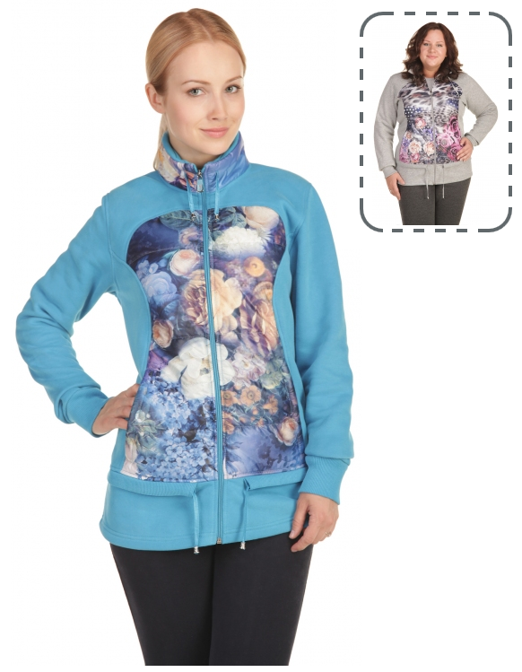 Удлинённая зимняя женская толстовка. Передняя часть и ворот отшиты из стёганой ткани с цифровой печатью рисунка. Передние карманы открытые. Ворот и пояс фиксируются шнурком из плащевой ткани. Наконечники шнурка выполнены из блестящего металла.