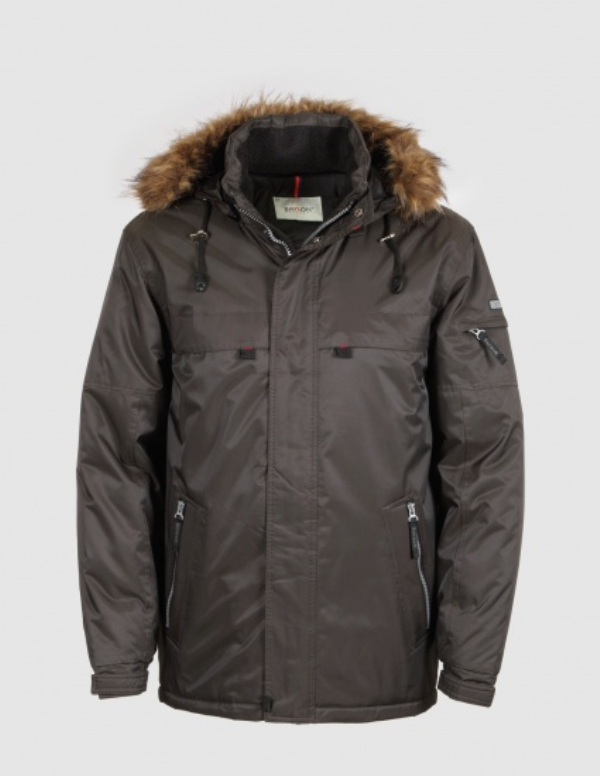 Четыре наружных кармана, два внутренних кармана на молниях, отстегивающийся капюшон с опушкой из искусственного меха енота, мех отстёгивается от капюшона, регулируемая кулиса по низу куртки, регулируемый теплоудерживающий манжет на рукаве.