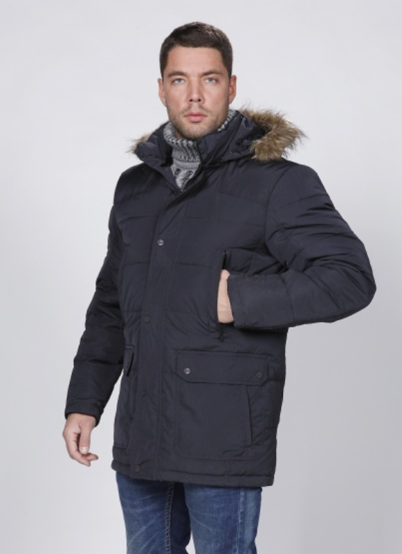 Шесть наружных карманов, три внутренних кармана на молниях, отстегивающийся капюшон с опушкой из искусственного меха енота, мех отстёгивается от капюшона, регулируемая кулиса по линии талии, трикотажный теплоудерживающий манжет в рукаве, длина позволяет носить пуховик с пиджаком.