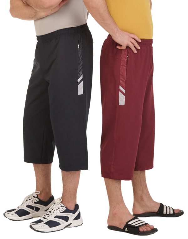 Трикотажные капри с поясом на резинке. Для дополнительной фиксации с внутренней стороны в пояс вставлен шнурок. Передние карманы вертикальные на молниях под листочками, отделанными принтованной плащёвкой в цвет основного материала и однотонной светло-серой. Кокетка отстрочена двойным швом.