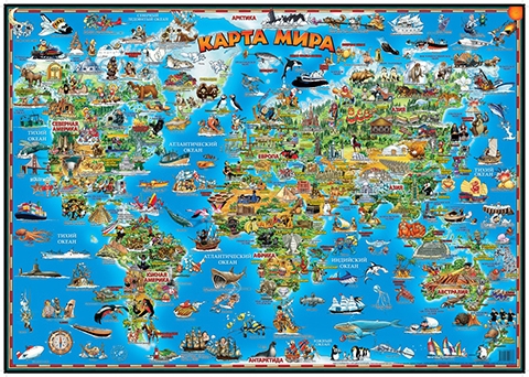 Жесткая непроницаемая пленка позволит сохранить карту в первозданном виде. Пролитый сок и вода не повредят красочный рисунок. Используйте карту в качестве подставки на обеденном столе, и тогда ребенок будет с интересом рассматривать яркие иллюстрации во время еды. Кроме того, все углы закруглены, что не даст ребенку пораниться. Карта порадует вас подробной информацией о традициях, фауне и даже играх стран мира, а факты из истории авиации и судоходстве удивит даже взрослых.