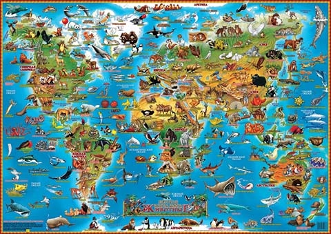 Карта порадует вас подробной информацией о млекопитающих, рыбах, птицах и пресмыкающихся из разных стран мира, а яркие иллюстрации будут притягивать внимание ребенка. Так он научится различать живых существ и узнает кто где живет.