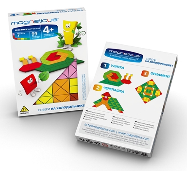 99 ярких элементов (23 квадрата, 14 прямоугольников, 62 треугольника) 7-ми цветов,3 картинки с образцами (улитка, цветок, орнамент).