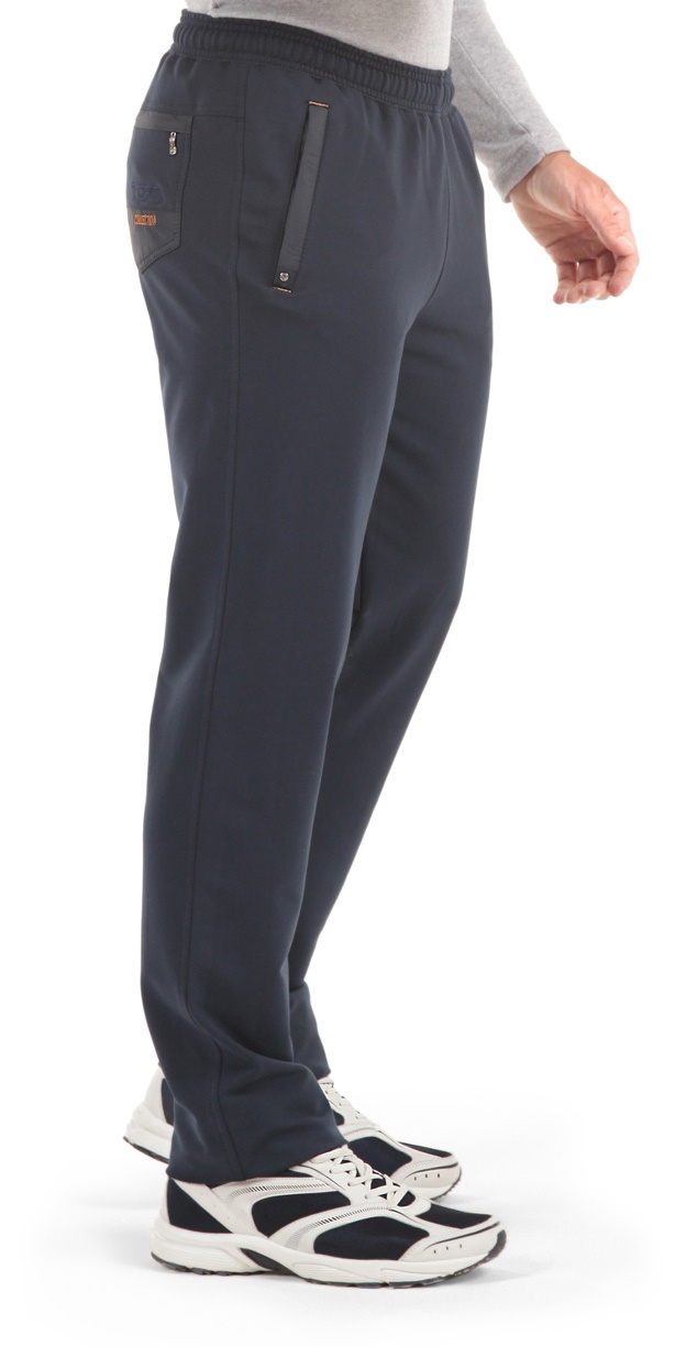 Спортивные трикотажные брюки с поясом на резинке. Для дополнительной фиксации в пояс с внутренней стороны вставлен шнурок. Брючины заужены книзу. Передние карманы на молниях под листочками, отделанными плащёвкой, декорированы по краям цветными закрепками и маленькими хольнитенами в нижней части. Задний карман накладной 5-ти угольный. Закрывается листочкой из плащёвки и фиксируется молнией. Элементы оформления кармана - отделка однотонной плащёвкой в цвет основного материала и 2-х цветная вышивка в фирменном стиле. Два размерных ряда.