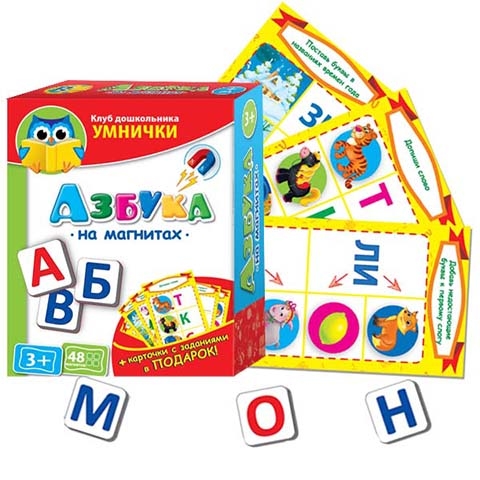 Состав: мягкие магниты -- 48 шт, карточки с заданиями -- 6 шт