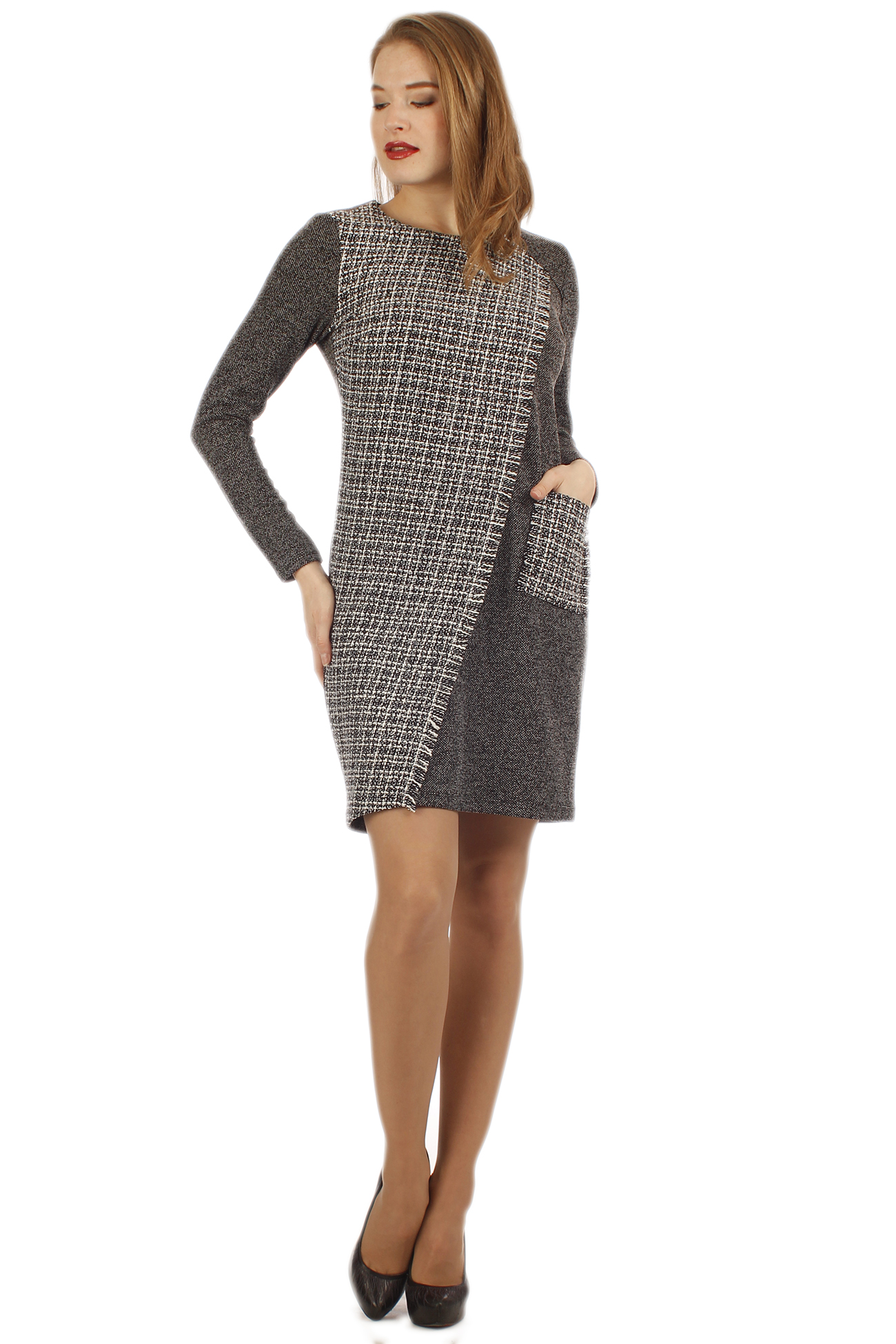 Платье, комбинированное из трикотажного полотна и ткани, сотканной из толстых нитей. Асимметричный крой платья не позволит остаться вам незамеченной ни на работе, ни на дружеской вечеринке. Украшением служет бахрома, выполненная вручную. Без подкладки. Длина платья увеличивается от размера к размеру (размер 44 89 см, размер 50 94 см).