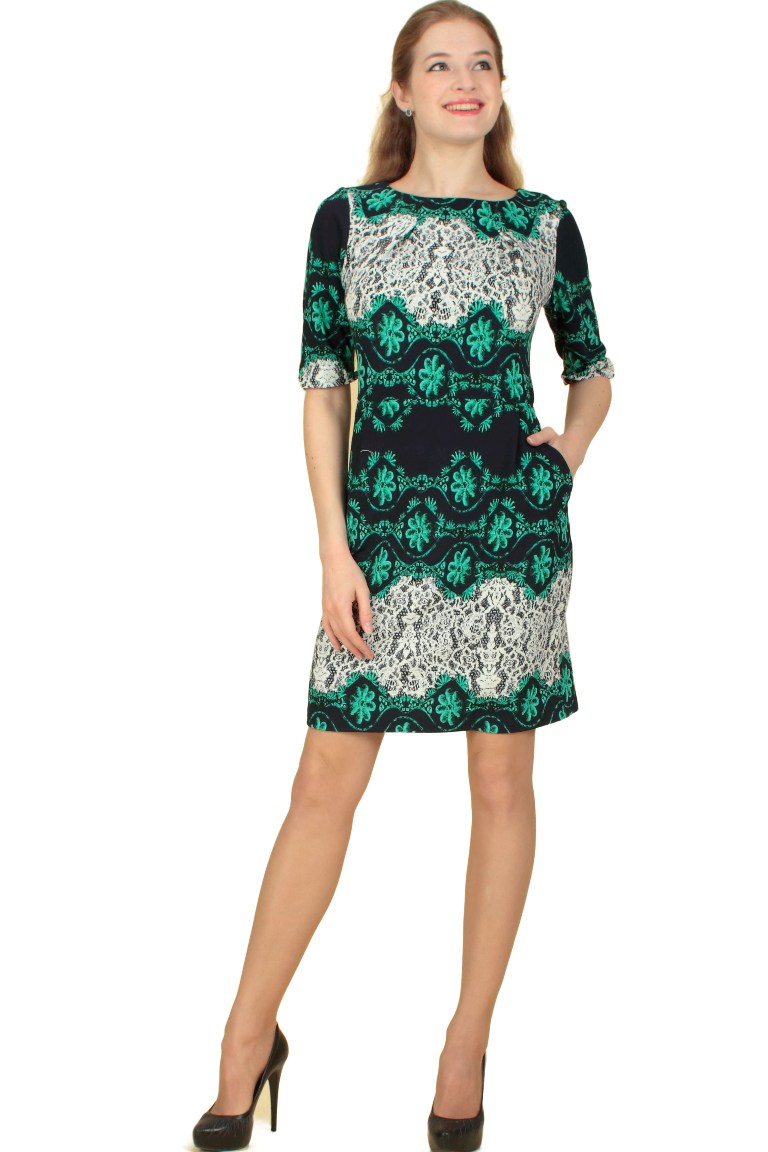 Платье приталенного силуэта из трикотажного полотна с красивым купонным рисунком.