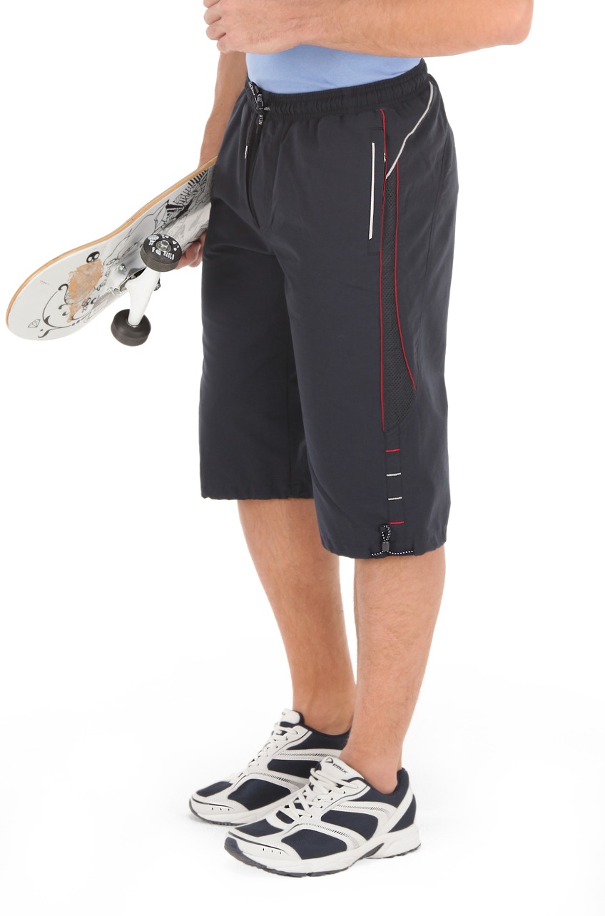 Капри с поясом на резинке. С наружной стороны в пояс вставлен шнурок с наименованием торговой марки. Псевдогульфик. По бокам вставки из трикотажной сетки в цвет основного материала, Два передних и один задний карманы на молниях под листочками. В швы листочек передних карманов, боковых вставок и рельефов вставлены цветные канты. Шов бокового рельефа переходит в кокетку. Бока декорированы цветными закрепками. Для регулировки ширины в нижнюю часть брючин вставлена шляпная резинка со стопперами.
