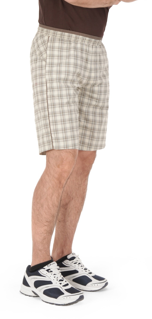 Шорты для отдыха из ткани в мелкую цветную клетку с поясом на резинке. Длина - по колено. Пояс 2-х цветный. С внутренней стороны в пояс вставлен шнурок . Псевдогульфик. Кокетка отстрочена двойным швом. В боковые швы вставлен цветной кант. Передние карманы на молниях под листочками. Широкий набор дизайнов