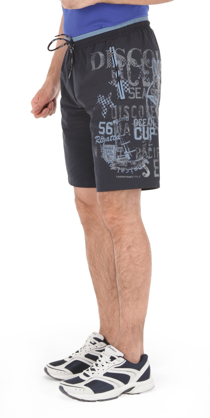Шорты для отдыха с поясом на резинке. Длина - по колено. Пояс 2-х цветный. Для дополнительной фиксации с наружной стороны в пояс вставлен шнурок с наименованием торговой марки. Псевдогульфик. Передние карманы на молниях <<в рамочку>>. Листочки, как и пояс, выполнены в двух цветах. Декоративная отделка контрастными вставками из основной ткани. Передняя и задняя часть левой стороны изделия украшена ярким принтом. Две размерные группы.