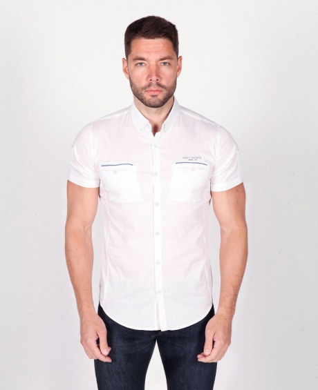 Мужская рубашка приталенный крой, два кармана, подворачивающийся рукав roll-up, застёгивается на пуговицу.