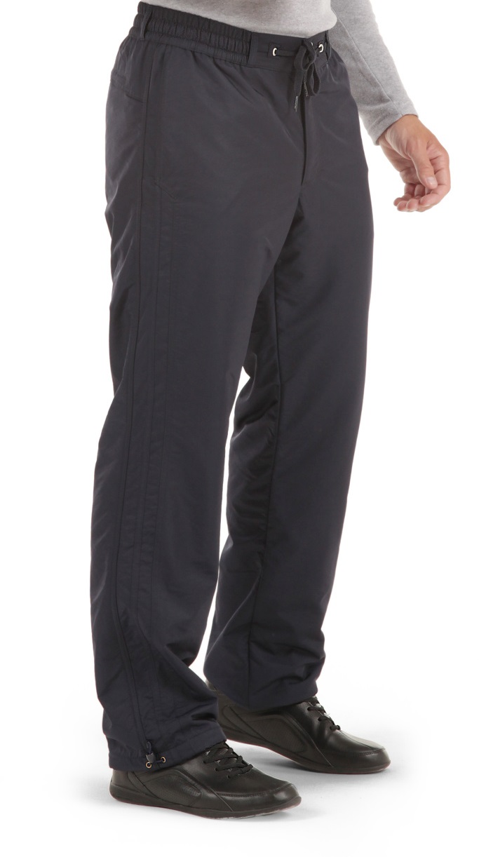Зимние брюки с гульфиком на молнии. Пояс мягкий с резинкой по бокам и сзади. Ширина пояса увеличена по сравнению с другими моделями. Поэтому фиксируется одновременно кнопкой и крючком. Внутрь пояса вставлен шнурок. Брючины прямые. Вертикальные рельефы вдоль наружных швов по всей длине брючин отстрочены двойными швами, образуя лампасы. Передние карманы вертикальные на молниях под листочками. Сзади кокетка, на уровне которой находятся листочки задних карманов, закрывающихся на молнии. Внизу ширина брючин регулируется стопперами со шляпной резинкой.
