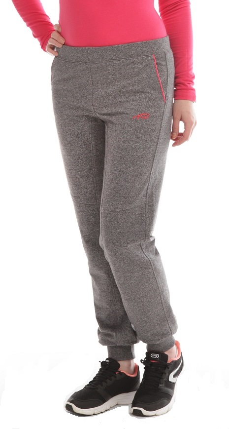 Спортивные трикотажные брюки с поясом на резинке. Посадка средняя. Зауженное лекало. Брючины заканчиваются манжетами. Пояс фиксируется шнурком, вставленным внутрь. Передние карманы открытые полукруглые, вдоль края вставлен цветной трикотажный кант, в цвет которого с левой стороны выполнена вышивка в фирменном стиле.