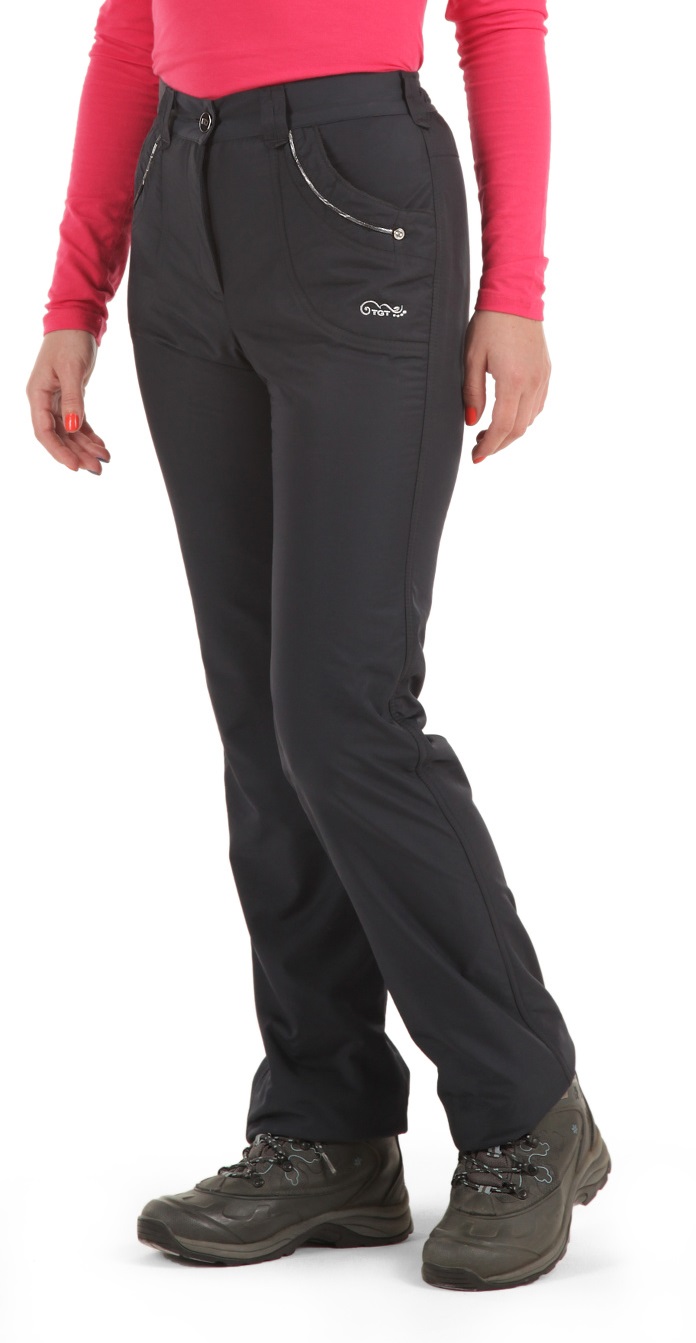 Зимние женские брюки с гульфиком на молнии. Пояс полужёсткий с резинкой сзади. Фиксируется блестящей пуговицей. Посадка высокая. Брючины заужены книзу. Передние карманы открытые полукруглые, декорированы полукруглыми рельефами, серебристым кантом и хольнитенами со стразами. На левом кармане вышивка серебряными нитками.