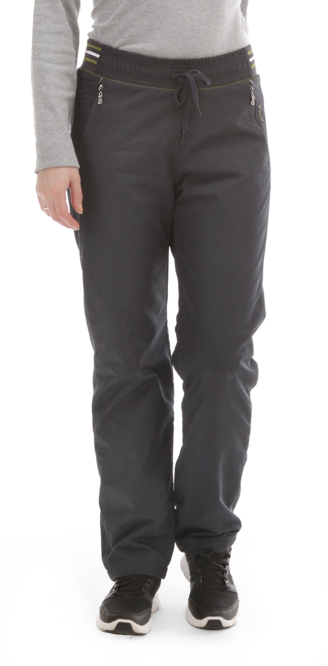 Зимние женские брюки с поясом на резинке и вставками из 3-х цветной рибаны. Для дополнительной фиксации снаружи в пояс вставлен шнурок. Внутренняя сторона пояса выполнена из основного материала в контрастном цвете (зелёный или оранжевый). Кант без наполнителя выполненный в цвет отделки вставлен в приточной шов пояса. Передние карманы на полупотайных молниях. Вдоль левого кармана цветная вышивка в фирменном стиле.