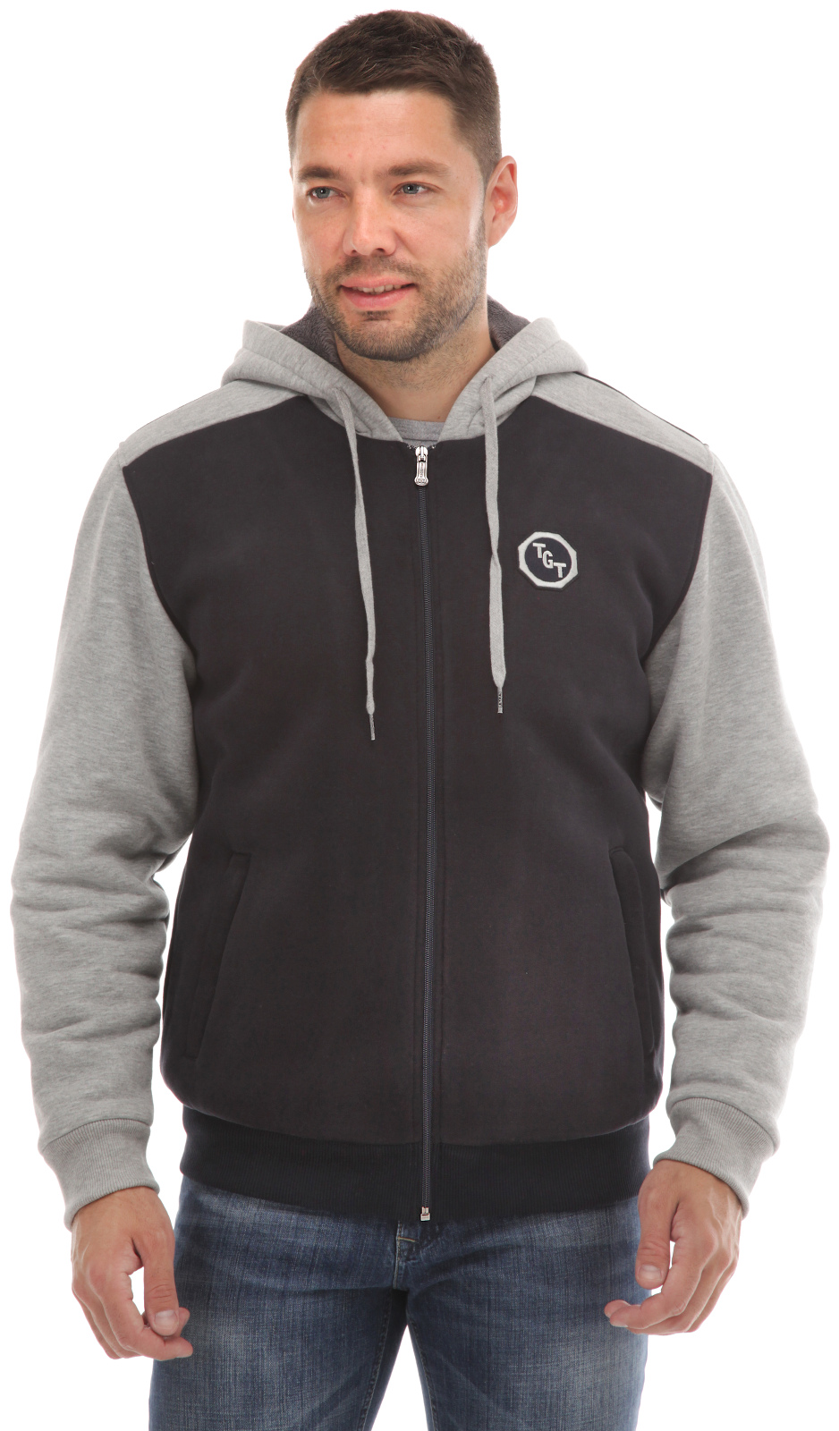 Зимняя утеплённая трикотажная куртка с поясом из кашкорсе и капюшоном. Утеплитель - искусственный мех "вельбоа" (плотность 300 г/м**2, цвет серый). Капюшон затягивается шнурком. Грудь и спина тёмные (тёмно-синие или антрацит меланж), рукава светлые (светло-серый меланж). Передние карманы на молниях под листочками. На груди шеврон. Внутренний карман закрывается на молнию. Два размерных ряда.
