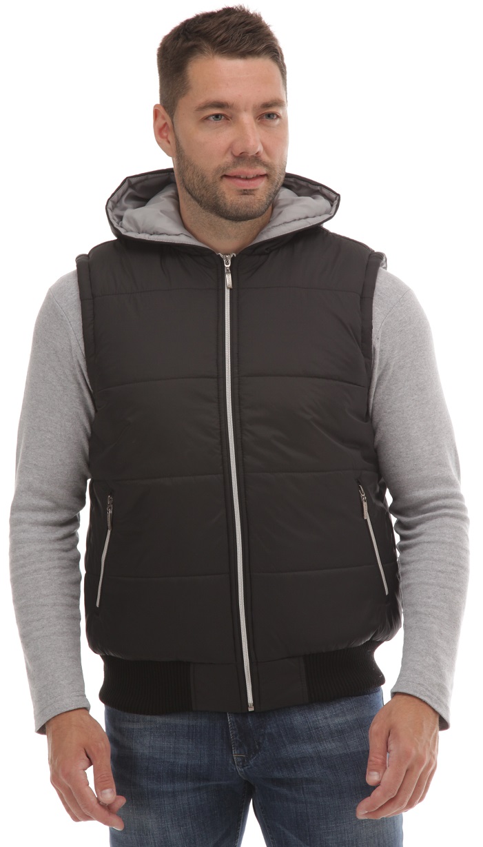 Жилет из курточной ткани с капюшоном и трикотажным поясом. Утеплитель - синтепон. Цветная подкладка. Внутренний карман фиксируется молнией. Передние карманы на молниях. Три варианта дизайна. 6312-1. Красная подкладка. С левой стороны 2-х цветная аппликация в фирменном стиле. Две размерные группы. 6312-2. Серая подкладка. В борт установлена серебристая молния. 6312-3. Оранжевая подкладка. В борт установлена двух - замковая молния оранжевого цвета. Молнии передних карманов оранжевого цвета под листочками.