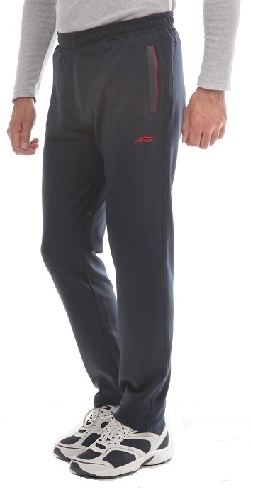 Трикотажные брюки с поясом на резинке. Для дополнительной фиксации в пояс с внутренней стороны вставлен шнурок. Брючины заужены книзу. Передние карманы на молниях под листочками вставлены в боковые рельефы трапецевидной формы. Листочки выполнены из двух видов плащёвки: принтованной в тон основного материала и однотонной гранатового цвета. Кокетка, как и боковые рельефы, имеет трапецевидную форму. С правой стороны под кокеткой расположен задний карман. Дизайн аналогичен передним карманам. С левой стороны под карманом вышивка в фирменном стиле в цвете гранат. Две размерные группы.