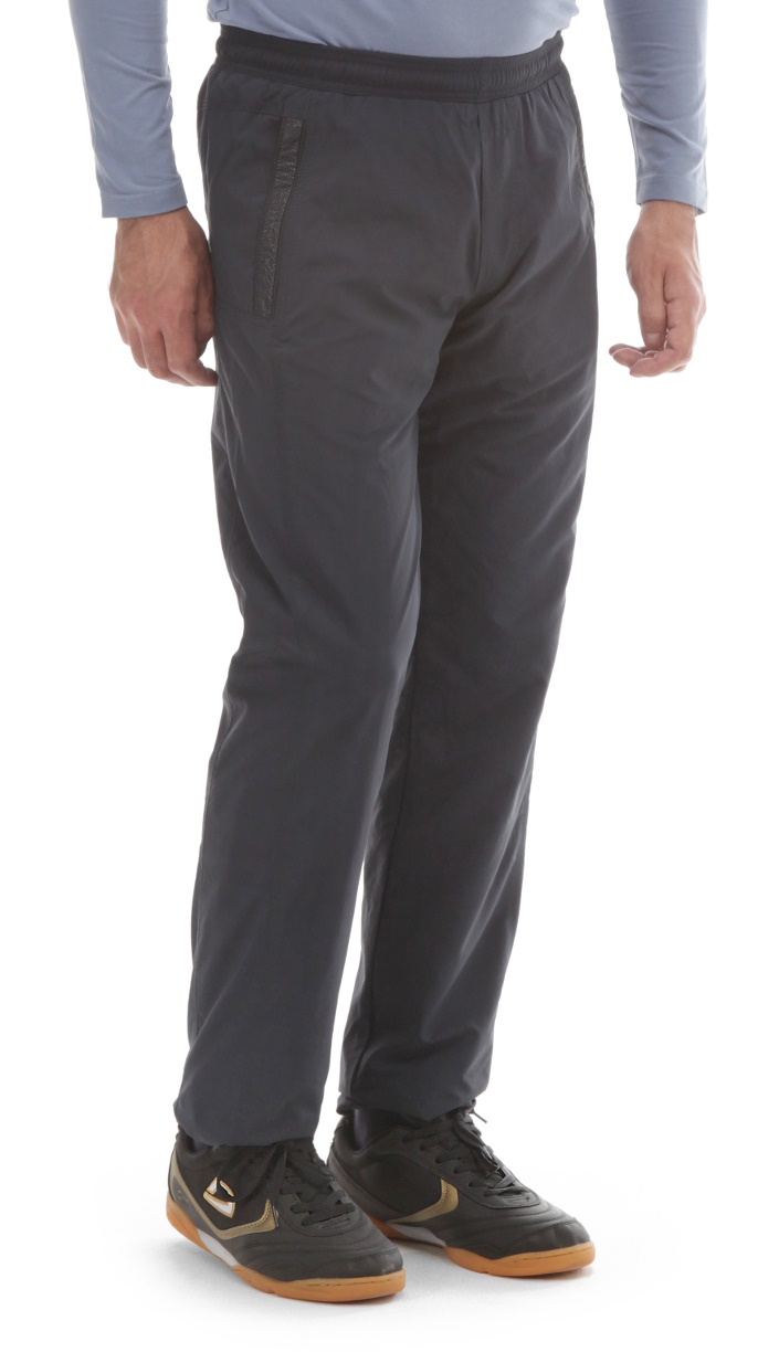 Спортивные брюки с трикотажной подкладкой и поясом на резинке. Для дополнительной фиксации в пояс с внутренней стороны вставлен шнурок. Псевдогульфик. Брючины заужены к низу. Для удобства одевания брюк в нижней части брючин в качестве подкладочного материала используется таффета, которая стыкуется с подкладкой - утеплителем (кулирная гладь) на уровне колена. Боковые швы, отстроченные тройным швом, и горизонтальные рельефы в верхней части выделяют область входа в передние карманы на молниях под листочками, декорированными кантом и принтованной плащёвкой в цвет основного материала. Задняя кокетка отстрочена тройным швом. Два размерных ряда.